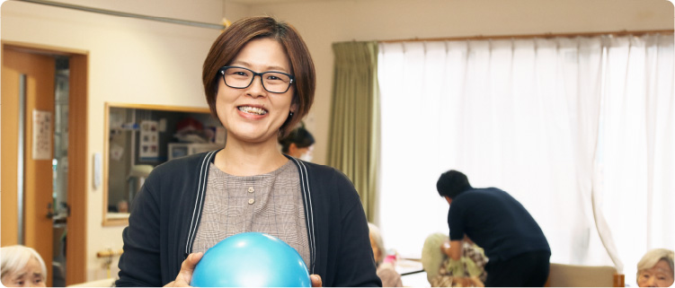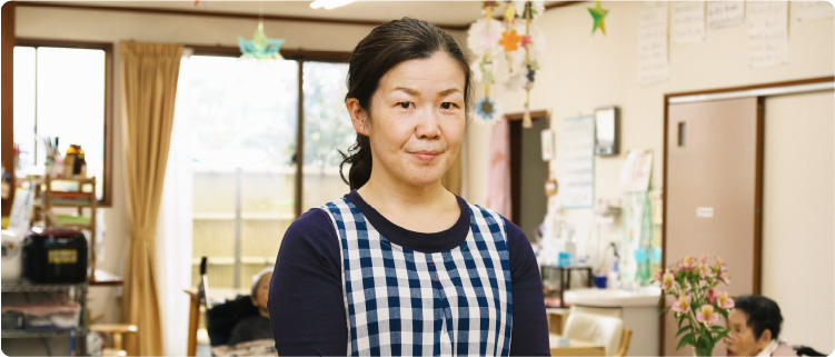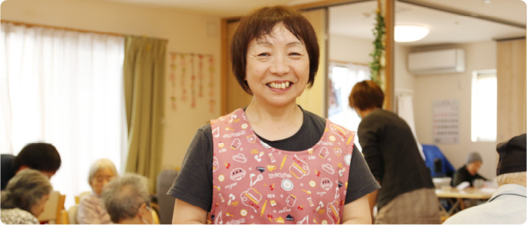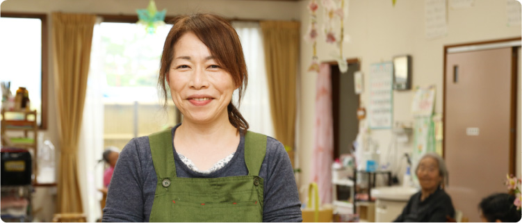 グループホームで、利用者さんの生活全般をサポートしています。ここでは時間に追われることなく、じっくりと時間をかけ、一人ひとりに合ったサポートをすることができています。だから、ちょっとした変化もすぐ気付けるんですね。理想の介護に取り組めている楽しさで、あっという間に10年以上が過ぎてしまいました。